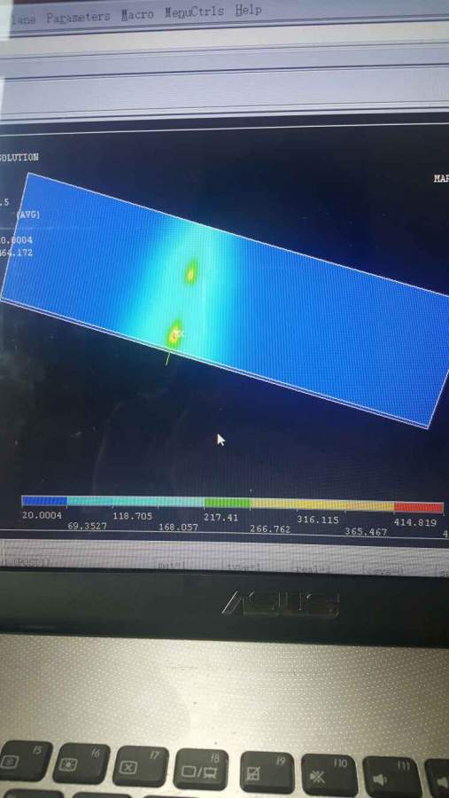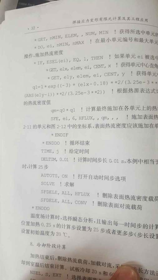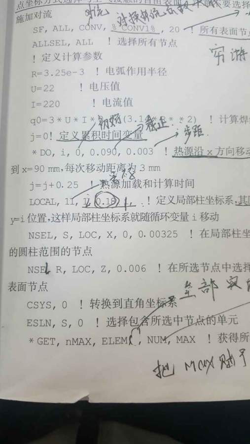 et,1,solid70 block,0,0.08,0,0.090,0,0.006 block,0.08,0.17,0,0.090,0,0.006 block,0.17,0.19,0,0.090,0,0.006 block,0.19,0.3,0,0.090,0,0.006.........以上为创建模型 vglue,all 划分网格用的GUI mptemp,1,20,100,300,400,500,700 mptemp,7,900,1470,1550,1600,2500,5000 mpdata,kxx,1,1,52,51,44,43,37,32.5, mpdata,kxx,1,7,26.2,31.4,120,120,120,120.......以上为导热率 *dim,conv1,table,17,1,0,temp,, *set,conv1(1,0,1),20 *set,conv1(1,1,1),2.5 *set,conv1(2,0,1),100 *set,conv1(2,1,1),5.4 *set,conv1(3,0,1),300 *set,conv1(3,1,1),7 *set,conv1(4,0,1),500 *set,conv1(4,1,1),7.7 *set,conv1(5,0,1),750 *set,conv1(5,1,1),8.2 *set,conv1(6,0,1),1000 *set,conv1(6,1,1),8.5 *set,conv1(7,0,1),1590 *set,conv1(7,1,1),9.1 *set,conv1(8,0,1),5000 *set,conv1(8,1,1),10.0.........以上为对流系数 Nsel,s,ext Sf,all,conv,%conv1%,20 Allsel,all以上为加载对流 r=3.25e-3 u=22 I=220 q0=3*U*I*0.7/(3.14*r**2) j=0 *do,i,0,0.090,0.003 j=j+0.15 Local,11,1,0.18,i, nsel,s,loc,x,0,0.00325 nsel,r,loc,z,0.006 csys,0 esln,s,0 *get,nmax,elem, ,num,max *get,nmin,elem, ,num,min *do,ei,nmin,nmax *if,esel(ei),eq,1,then *get,elx,elem,ei,cent,x *get,ely,elem,ei,cent,y q1=1*exp((-3)*(elx-0.18)**2/(3.25e-3**2))*exp((-3)*(abs(ely-i))**2/(3.25e-3**2)) qm=q0*q1 sfe,ei,6,hflux,,qm,,, *endif *enddo.......y以上为加载高斯热源 Time,j deltim,0.01 Autos,on Solve求解 Sfdele,all,hflux Sfdele,all,conv *enddo Nsel,s,ext Sf,all,conv,%conv1%,20 Allsel,all Time,20 Deltim,0.05 Outres,all,all autots,on Solve Time,60 Deltim,0.5 solve 发自小木虫Android客户端 |