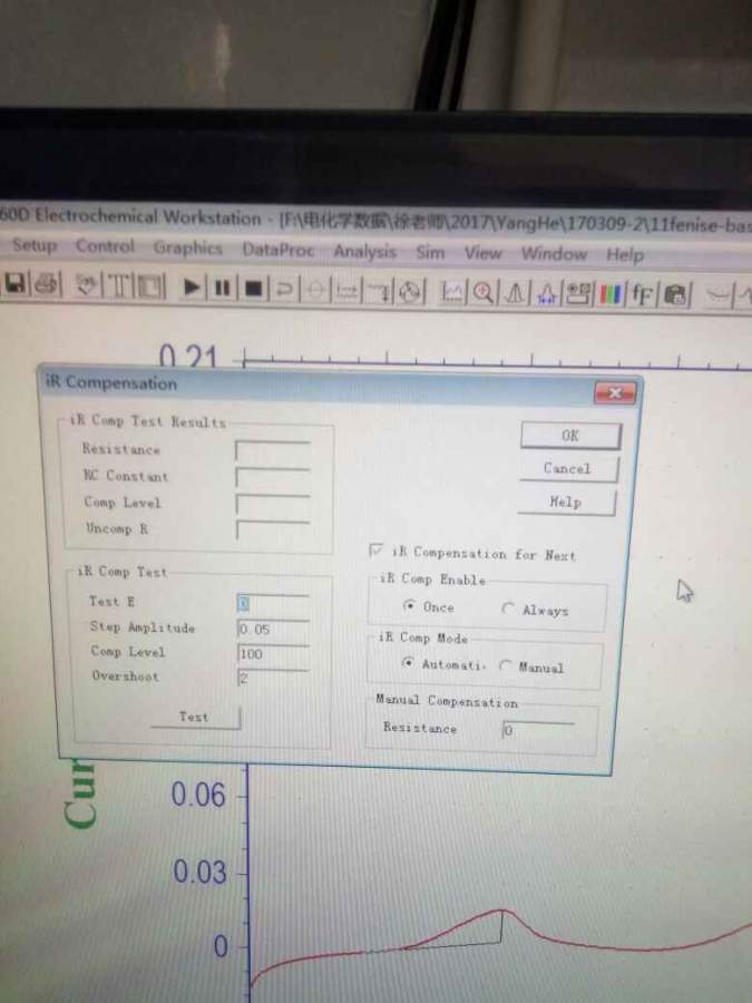 先设置好测试的参数,然后设置iR补偿test E(没有电化学反应的电位),点test。OK关闭界面
