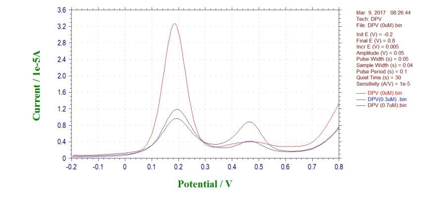 辰华760工作站检测金电极表面修饰不同浓度SH-DNA后的循环伏安图谱,铂电极为对电极,饱和甘汞电极为参比电极,支持电解液为含有1mM [Fe(CN)6]4-/3- 和0.1M KCL的pH7.4PBS溶液。问题1,CV图里指示峰的黑色线代表什么意思。问题2,随着SH-DNA浓度升高,氧化还原峰对应的电位差值离大,而且峰变得平坦,几乎看不见峰电流,怎么才能确定在金电极上修饰SH-DNA的最大浓度。问题3,DPV图的0.3V-0.8V怎么不是接近0A的平滑线。问题4,文献里写的金电极用氧化铝粉打磨成镜面,是用肉眼观察一点划痕没有才能使用吗?才开始接触电化学传感器,请大家赐教。