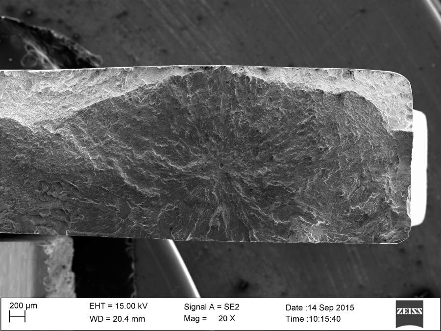板状拉拉疲劳试样,材料TC4,状态:激光焊接,之后进行表面喷丸强化处理。 这两图对应的试样都是经过喷丸处理的,引入表面压应力的原因,都从内部冶金气孔处出现疲劳裂纹源。 请教各位大侠,这两个图有什么区别吗? 从疲劳断裂的机理上给说明一下,谢谢了。 5-3-01.jpg 5-7-01.jpg |