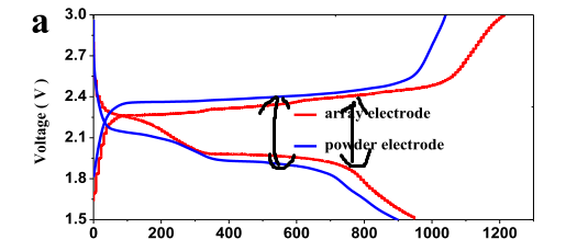 胖胖好。充放电曲线非常简单,从你给出的图看可获得以下信息。1、红线要比蓝线好,充电电压低,放电电压反而高说明红线电池极化小,电压效率高、可逆性高、比容量也大些。2、这两张图都不够理想,放电电压有两个平台,库仑效率也不高,做为电池来说2.3伏左右的电压偏低。最理想的电极充放电曲线是,充放电两条线无限靠近,两线要和水平线平行度越高越好.两条线足够长比容量大,两天线长短一致,库伦效率接近100%,这种理想的线很少有人遇到。总之,曲线简单、修长、漂亮的曲线都很好。 |