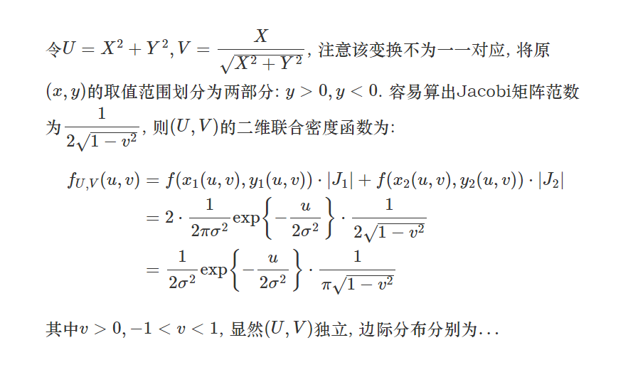 X,Y相互独立,且服从(0,σ^2)的正太分布 证明:x^2+y^2和x/(x^2+y^2)∧1/2独立,并求他们的边沿密度函数。 @laosam280 发自小木虫Android客户端 |