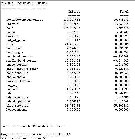 在几何优化之前,先build--bonds--calculate,键构建好之后,再用discover做几何优化。 力场采用compass已测试成功。 发自小木虫Android客户端 |