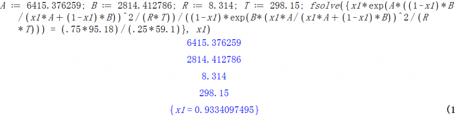 A := 6415.376259; B := 2814.412786; R := 8.314; T := 298.15; solve({x1*exp(A*((1-x1)*B/(x1*A+(1-x1)*B))^2/(R*T))/((1-x1)*exp(B*(x1*A/(x1*A+(1-x1)*B))^2/(R*T))) = (.75*95.18)/(.25*59.1)}, x1) 在maple运行的,matlab跟这个差不多,不知道哪儿错了,求高手帮忙 |