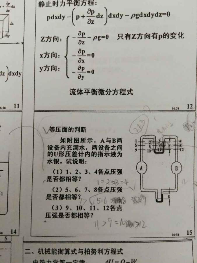 1. 如附图所示,A与B两设备内充满水,两设备 之间的U形压差计内的指示液为水银。试说明: (1)1、2、3、4各点压强是否都相等? (2)5、6、7、8各点压强是否都相等? (3)9、10、11、12各点压强是否都相等? (4)两U形压差计读数R与H是否相同?为什么? 发自小木虫Android客户端 |