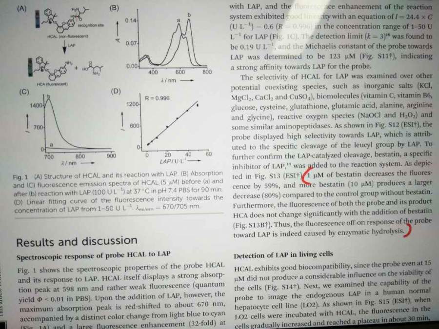图中红括号内怎么都理解不了。 文中合成了一种探针HCAL,只有肝病中高表达的LAP(一种酶)才能断掉其linker,使其发出荧光。LAP酶活性越大,荧光越强。为了证明是LAP催化 特异性断键,在体系中加入了LAP的抑制剂。 红括号内的意思是在体系中加了LAP的抑制剂后,与没加抑制剂的组相对照发现 加了抑制剂的荧光减弱。倒数第二句话说探针及其产物的荧光加入抑制剂后无明显变化。 怎么都理解不了……这几句话是不是有点自相矛盾啊……酶抑制剂不是会降低酶活么?所以荧光减弱。但为啥随后又说探针及其水解产物加入抑制剂前后荧光无明显变化??? 小白求大神给解释一下…… @dut_ameng 发自小木虫Android客户端 |