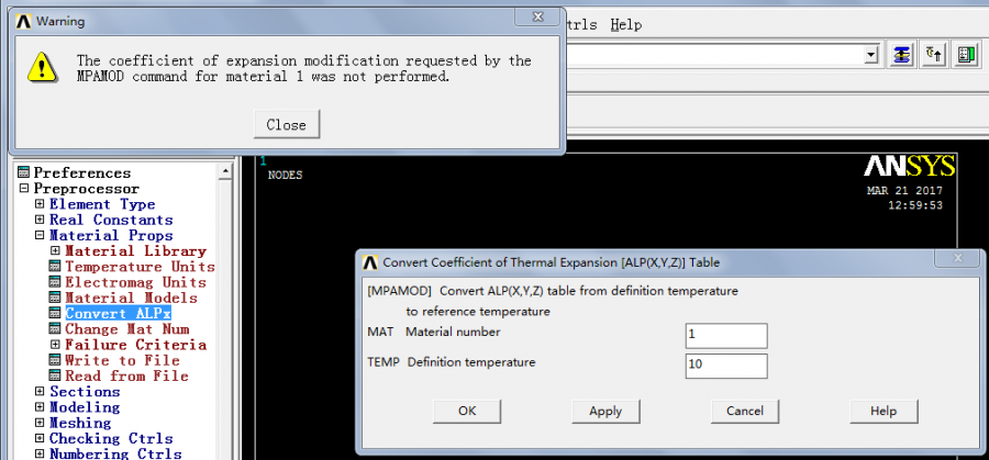 ANSYS 中添加热膨胀系数出错, 提示The coefficient of expansion modification requested by the MPAMOD command for material 1 was not performed. 求问是怎么回事?没做过热应力问题,本来就是一个单纯的结构分析,然后老师让加一下热膨胀系数和热场,于是就出错了,求大神指点 |