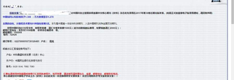 各位老师好,之前投了一篇文章给《软件》非核心,(主办单位:中国电子学会;天津电子学会 出版周期:月刊 ISSN:1003-6970 CN:12-1151/TP (2016版)复合影响因子:1.388 (2016版)综合影响因子:1.161 )。 编辑现在说让交1500发表费,新人第一次投稿有回复的,文章总字数7812,不知道这个期刊值不值得给他交这个钱,如果这个期刊真的是比较水的,不想浪费这个钱,呜呜。 求助各位老师,谢谢了。 ![]() 知网关于这个期刊的信息:https://navi.cnki.net/KNavi/Jour ... oundationcontainerH 期刊官网是:https://www.ccomsoft.com/ ![]() ![]() 1.png 2.jpg |