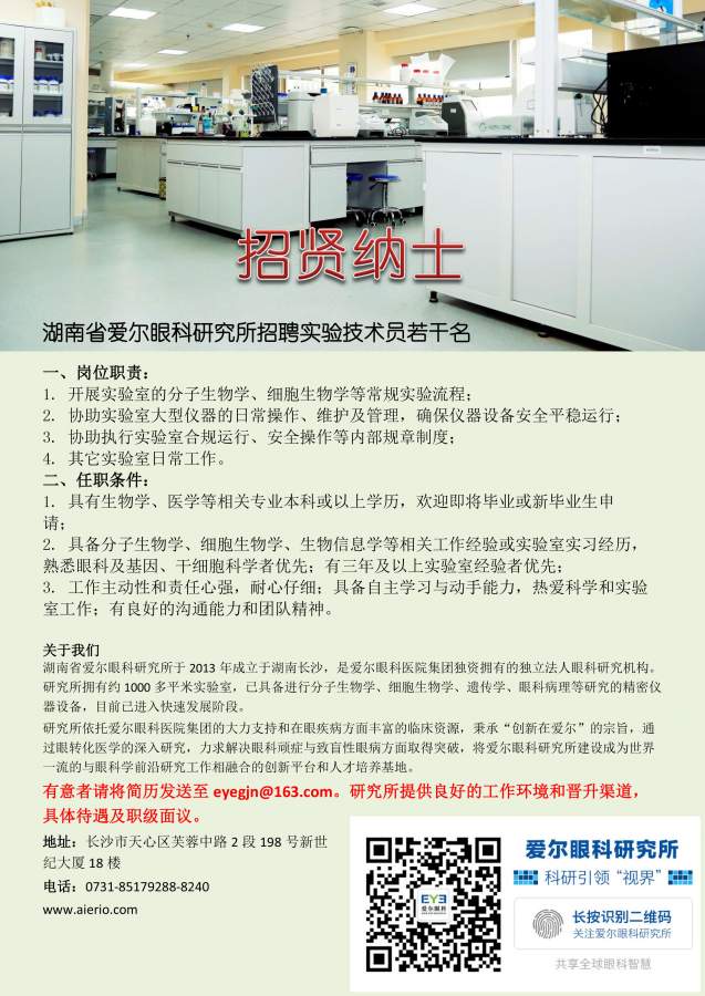 湖南省爱尔眼科研究所招聘实验技术员若干名 一、岗位职责: 1. 开展实验室的分子生物学、细胞生物学等常规实验流程; 2. 协助实验室大型仪器的日常操作、维护及管理,确保仪器设备安全平稳运行; 3. 协助执行实验室合规运行、安全操作等内部规章制度; 4. 其它实验室日常工作。 二、任职条件: 1. 具有生物学、医学等相关专业本科或以上学历,欢迎即将毕业或新毕业生申请; 2. 具备分子生物学、细胞生物学、生物信息学等相关工作经验或实验室实习经历,熟悉眼科及基因、干细胞科学者优先;有三年及以上实验室经验者优先; 3. 工作主动性和责任心强,耐心仔细;具备自主学习与动手能力,热爱科学和实验室工作;有良好的沟通能力和团队精神。 关于我们 湖南省爱尔眼科研究所于2013年成立于湖南长沙,是爱尔眼科医院集团独资拥有的独立法人眼科研究机构。研究所拥有约1000多平米实验室,已具备进行分子生物学、细胞生物学、遗传学、眼科病理等研究的精密仪器设备,目前已进入快速发展阶段。 研究所依托爱尔眼科医院集团的大力支持和在眼疾病方面丰富的临床资源,秉承“创新在爱尔”的宗旨,通过眼转化医学的深入研究,力求解决眼科顽症与致盲性眼病方面取得突破,将爱尔眼科研究所建设成为世界一流的与眼科学前沿研究工作相融合的创新平台和人才培养基地。 有意者请将简历发送至eyegjn@163.com。研究所提供良好的工作环境和晋升渠道,具体待遇及职级面议。 地址:长沙市天心区芙蓉中路2段198号新世纪大厦18楼 电话:0731-85179288-8240 www.aierio.com 招聘简章20170317.jpg 湖南省爱尔眼科研究所招聘实验技术员若干名 一、岗位职责: 1. 开展实验室的分子生物学、细胞生物学等常规实验流程; 2. 协助实验室大型仪器的日常操作、维护及管理,确保仪器设备安全平稳运行; 3. 协助执行实验室合规运行、安全操作等内部规章制度; 4. 其它实验室日常工作。 二、任职条件: 1. 具有生物学、医学等相关专业本科或以上学历,欢迎即将毕业或新毕业生申请; 2. 具备分子生物学、细胞生物学、生物信息学等相关工作经验或实验室实习经历,熟悉眼科及基因、干细胞科学者优先;有三年及以上实验室经验者优先; 3. 工作主动性和责任心强,耐心仔细;具备自主学习与动手能力,热爱科学和实验室工作;有良好的沟通能力和团队精神。 关于我们 湖南省爱尔眼科研究所于2015年成立于湖南长沙,是爱尔眼科医院集团独资拥有的独立法人眼科研究机构。研究所拥有约1000多平米实验室,已具备进行分子生物学、细胞生物学、遗传学、眼科病理等研究的精密仪器设备,目前已进入快速发展阶段。 研究所依托爱尔眼科医院集团的大力支持和在眼疾病方面丰富的临床资源,秉承“创新在爱尔”的宗旨,通过眼转化医学的深入研究,力求解决眼科顽症与致盲性眼病方面取得突破,将爱尔眼科研究所建设成为世界一流的与眼科学前沿研究工作相融合的创新平台和人才培养基地。 有意者请将简历发送至aierio@aierchina.com。研究所提供良好的工作环境和晋升渠道,具体待遇及职级面议。 地址:长沙市天心区芙蓉中路2段198号新世纪大厦18楼 电话:0731-85179288-8240 www.aierio.com 招聘简章20170317.jpg [ Last edited by vicfree on 2018-2-24 at 10:39 ] |