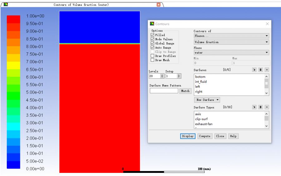 fluent中使用VOF+凝固/融化模型,给一个封闭的未充满水的容器冻冰,上、下、右边为绝热壁面,左边为热流(负值,吸热)边界条件。设置空气为主相,液体为次相,初始化的时候设置液相的体积分数为0,然后patch容器下部液相的体积分数为1。空气的物性设置为理想气体,水的物性采用分段设置(0-273.15K(冰)的时候采用冰的物性,273.15k以上采用0摄氏度的水的物性)。时间步长为10e-4,计算很短的时间之后温度就变成负值了,初学者,不知道问题在哪儿,恳请高手指点一下。 phases.png@wuming524 |