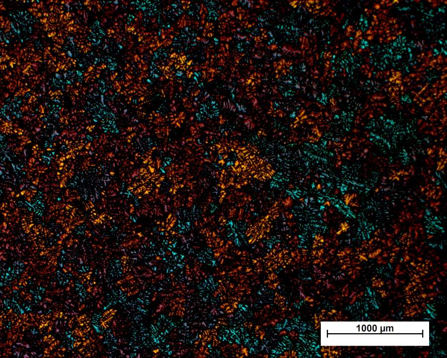 A356铝硅合金做彩色金相,样品是标准拉伸模具浇注后的拉伸试样标距位置;配制浓度5g/200ml 氟硼酸溶液,腐蚀时间3min,腐蚀期间电流100~150mA,腐蚀结果如下图,但这样的金相组织无法分辨出晶粒和晶粒区别,是否是因为标距处试样冷速快导致枝晶臂穿插不能辨认,求大家建议,谢谢! 4-4.jpg |
