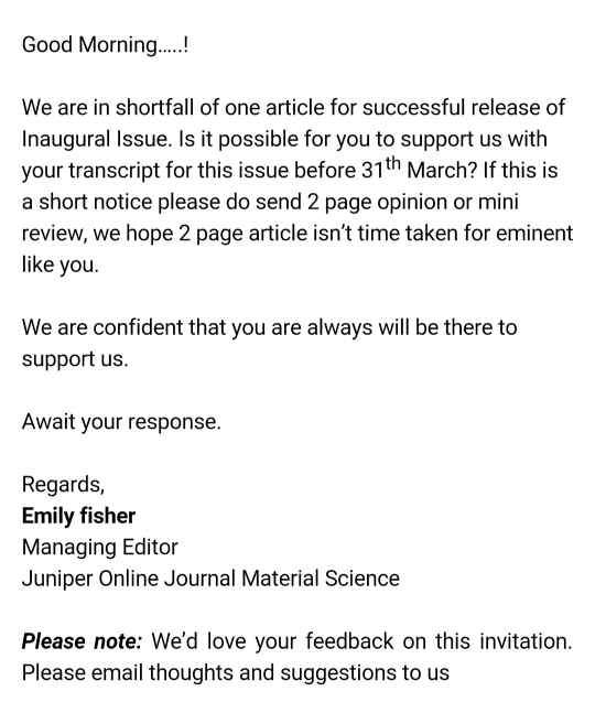 Good Morning…..! We are in shortfall of one article for successful release of Inaugural Issue. Is it possible for you to support us with your transcript for this issue before 31th March? If this is a short notice please do send 2 page opinion or mini review, we hope 2 page article isn’t time taken for eminent like you. We are confident that you are always will be there to support us. Await your response. Regards, Emily fisher Managing Editor Juniper Online Journal Material Science Please note: We’d love your feedback on this invitation. Please email thoughts and suggestions to us 这是journal of material science期刊吗,信中提到的inaugural issue是什么意思啊,还有是要写2页的综述吗 求助有经验的虫友 谢谢啦 发自小木虫Android客户端 |