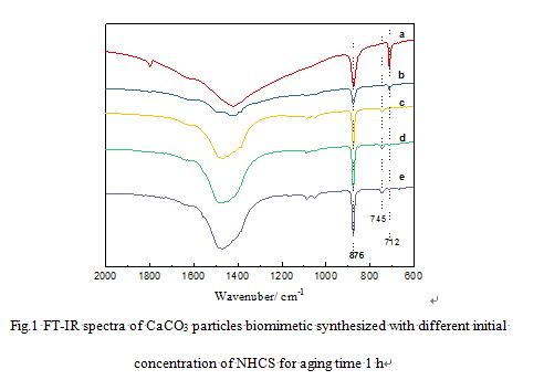 Figure 1 shows FTIR spectra of peaks at 712 cm-1, 746 cm-1, and 876 cm-1. It is interesting to note that the new band at 746 cm-1 corresponding to vaterite also appears (Figure 1b-e) [27-30], which is different from that of calcium carbonate obtained in the pure water system without any additive of NHCS(Figure 1a). In addition, the different intensity of these peaks (712 cm-1, 746 cm-1, and 876 cm-1) may result from the different contents of the vaterite formed at different aging times. In addition to vaterite and calcite, the higher of the initial concentration of NHCS, the more vaterite present, the higher intensity ratio of bands at 746 and 712 cm−1 (I746/ I712) respond in FTIR spectrum of the sample prepared with using NHCS as an organic matrix to biomimetic synthesize calcium carbonate. This observation is supplemented by XRD analysis (shown in Figure 2).