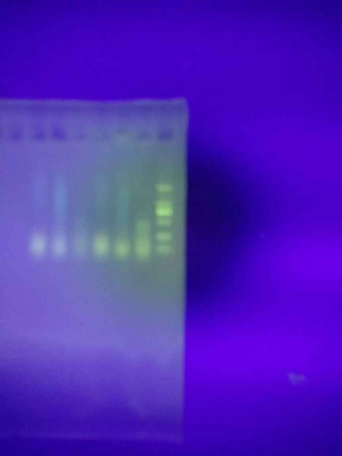 我在做PCR时出现严重拖尾现象,不知道是怎么回事,请高手指点 ? ?我的目的片段大约为700bp,利用的反应体系如下: 94 度,5分钟 94 度? ???30 秒 60 度? ? 30 秒 72??度? ?45 秒? ?? 30个循环 72 度7分钟 发自小木虫Android客户端 |