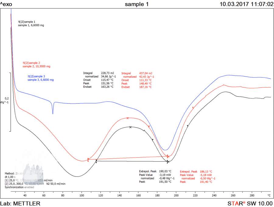 如图是三个平行样品的non-isothermal 谱图,测试参数一样,三者的重量不一样。 样品是丙烯酸酯水性涂料,交联剂是三聚氰胺衍生物。 样品三的不平行应该是来自于制样过程。 样品一和二的第一个系热峰是溶剂,之后的第一个放热峰是固化过程的交联反应,求问190°C 之后的放热峰该如何解释呢? IMG_2771.JPG |