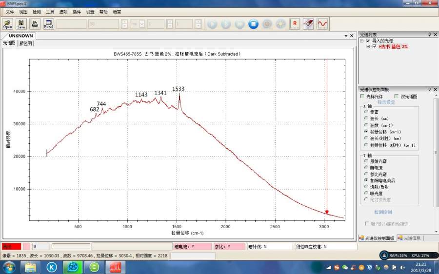 我用必达泰克便携式拉曼仪测试丝织品上的蓝色颜料,波长785nm,几个特征峰和靛青,青金石颜料的特征峰不相符,本人对绘画一点都不了解,所以就不知道怎么查找对应的物质了,有哪位老师知道或者有什么方法可以查到拉曼峰对应的物质么?特征峰有1533/1341/744/682/1143。 拉曼.jpg |