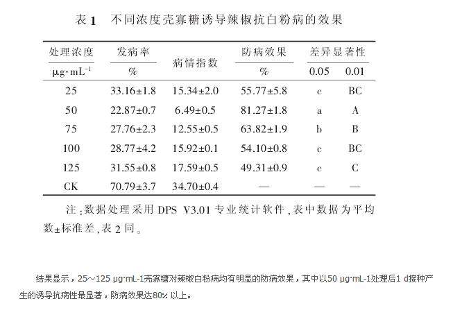 白粉病是辣椒的一种常发疾病,比较难防治,这主要是由病菌危害特点所决定的。 壳寡糖作为一种绿色天然可食用的新型生物农药,可以诱导辣椒对白粉病产生抗性。 将壳寡糖配制成25,50,75,100,125 μg/mL溶液。在辣椒成株期采用每株定量10 mL喷施,喷药后1d整株辣椒喷雾接种白粉病菌孢子悬浮液,以清水做对照;25 d后调查辣椒发病情况,计算病情指数。 1.jpg |