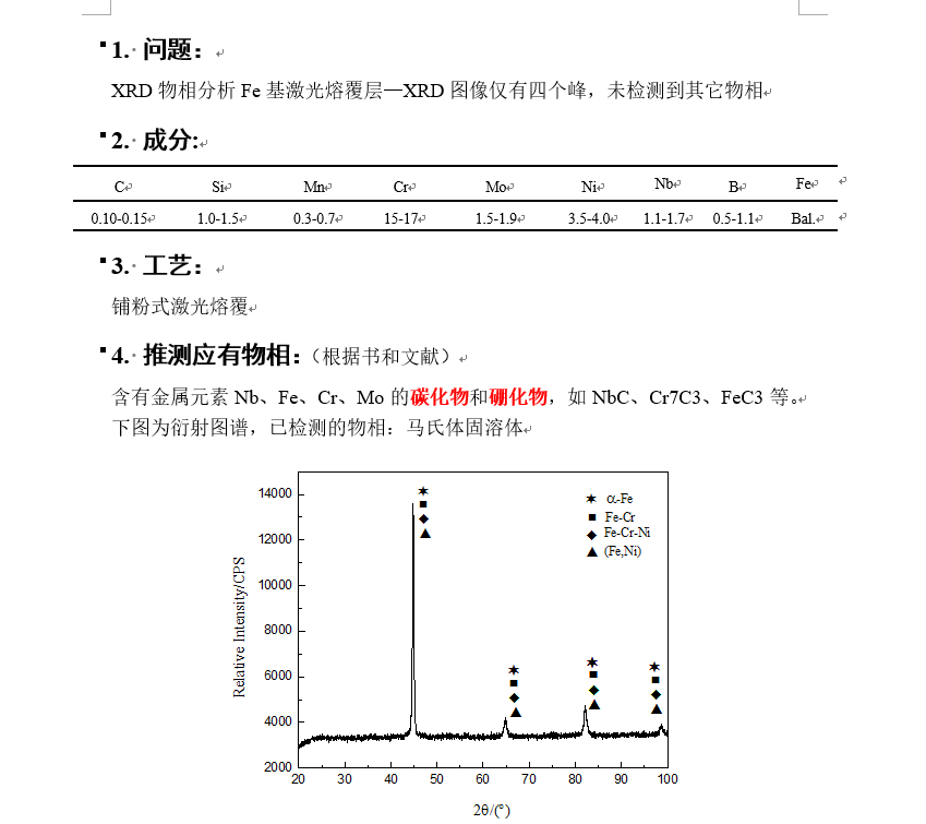 XRD物相分析Fe基激光熔覆层—XRD图像仅有四个峰,未检测到其它物相已有1人参与