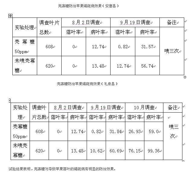 在陕北的安塞县和礼泉县,从4月或5月开始应用壳寡糖,与正常管理喷化学农药相比,壳寡糖对褐斑病有明显的防治效果,病叶率明显下降。对防止苹果落叶效果更明显。在试验中发现,用壳寡糖处理,虽有褐斑病侵染,但苹果叶不发黄,不落叶。结果表明,壳寡糖能有效的防治苹果落叶病。 1.jpg |