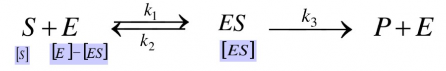 对下图的一个酶促的单底物反应:(S为底物,E为酶,P为产物,k为速率常数, ES为酶-底物复合物,k2为ES逆反应速率常数) 其速率方程一般表示为: v = k3 [ES]。 我的问题是,酶促反应的速率方程可不可以是 v = k[S]?为什么? 谢谢大家 9P6%)ZBM(2NXIULPTX[A{(O.png |
