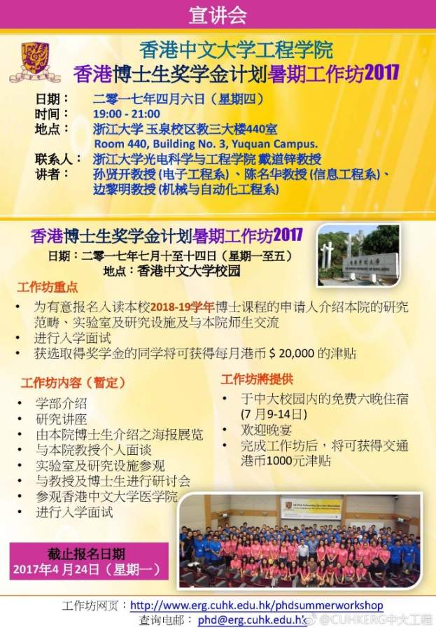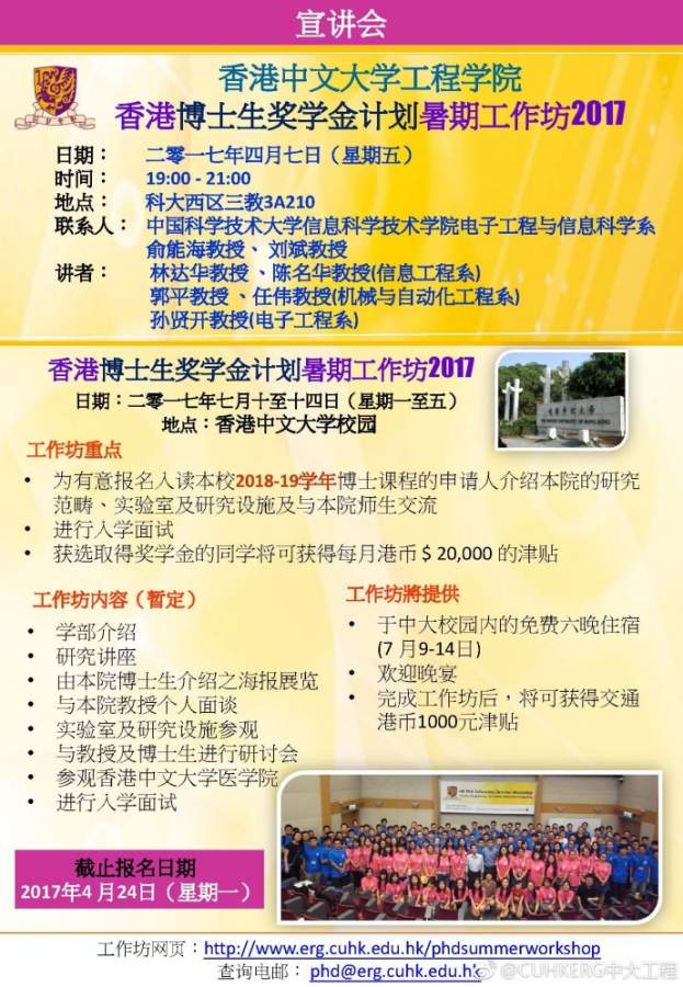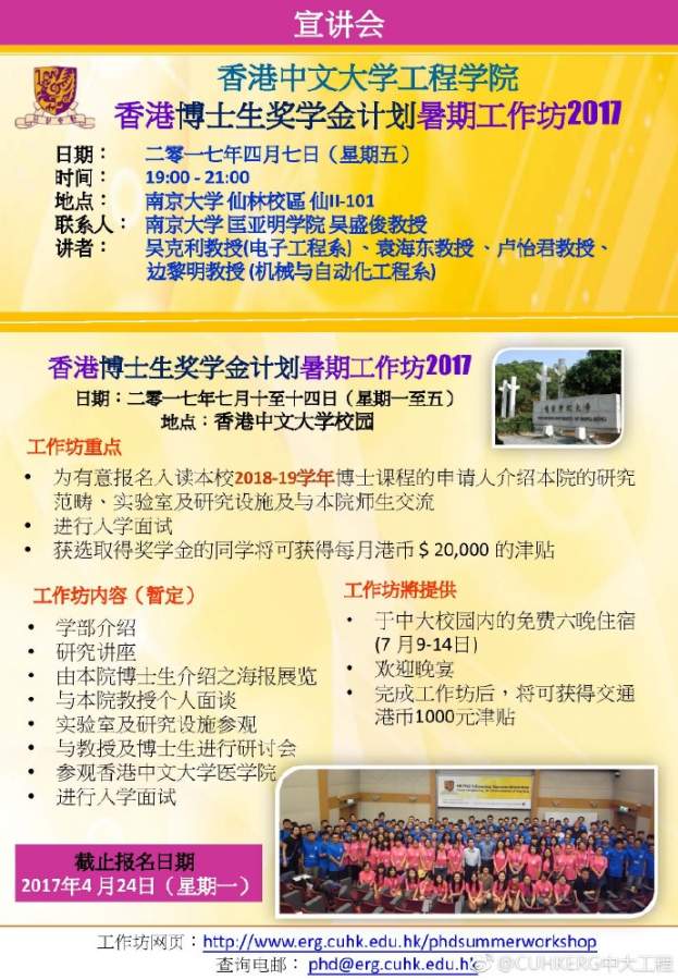 新的宣讲会!!! Harbin Institute of Technology 哈尔滨工业大学 香港中文大学工程学院 郭平教授 (机械与自动化工程系)将于4月14日(周五)访问哈尔滨工业大学,介绍《香港博士生奖学金计划暑期工作坊2017》。地點為哈尔滨工业大学正心楼122, 晚上7时開始。 Weibo: http://weibo.com/5558237435/ECNvbA2j2 Huazhong University of Science & Technology 华中科技大学 香港中文大学工程学院 龚锡挺教授(系统工程与工程管理学系)将于4月7日(周五)访问华中科技大学,介绍《香港博士生奖学金计划暑期工作坊2017》。地點為华中科技大学科技楼南楼702, 下午4时開始。 Weibo: http://weibo.com/5558237435/ED7wK7Nt0 Huazhong University of Science & Technology 华中科技大学 香港中文大学工程学院 孙贤开教授(电子工程系)将于4月18日(周二)访问华中科技大学,介绍《香港博士生奖学金计划暑期工作坊2017》。地點為华中科技大学南五楼613教室, 晚上7时開始。 http://weibo.com/5558237435/ECMmo3NRp |