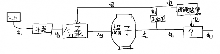 请问如何实现以下功能,打开开关气泵工作将密封罐内空气抽出,当罐内气压减少到-67KPa,气泵停止工作,30秒后释放掉罐内负压。 请问下图最右边问号内的原件应该是什么,普通电磁阀可以吗,是要能控制气路开闭就行,谢谢解答! |