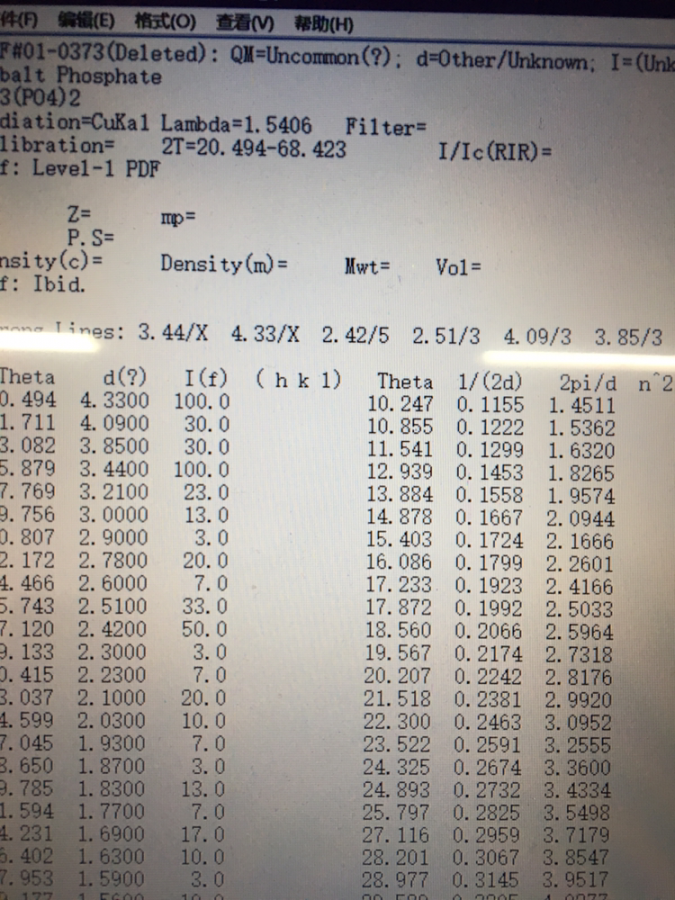 在做XRD衍射分析的时候碰到了对应的PDF卡片号,但是卡片里面各种信息都有,就是没有晶面信息,这怎么办?文献里也没有这方面信息,换成search mach也不行。求大神帮帮忙,谢谢 @Monash2011 发自小木虫IOS客户端 |
