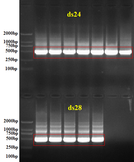 dsRNA纯化完后电泳检测时,我的基因目的条带是500bp,但目的条带上面还有其他条带,是什么?为什么会有这样的条带出现?会不会影响后续的干扰实验?合成和纯化都是按实验室的步骤进行的。做了几次,都出现这种情况。不知道原因出在哪里?求各位大神帮忙解答一下。谢谢! 4PP`KI0~QHK63G8NVETH(OB.png |