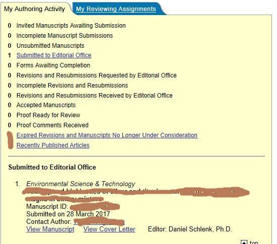 论文投到acs旗下的期刊,自己非通讯作者,不知道通讯作者的邮箱密码。进系统后只能看到目前的状态是Submitted to Editorial Office。想问下这是什么意思?文章到底是送审了还是没有送审?因为从列表来看没有under review的选项 11111.jpg |