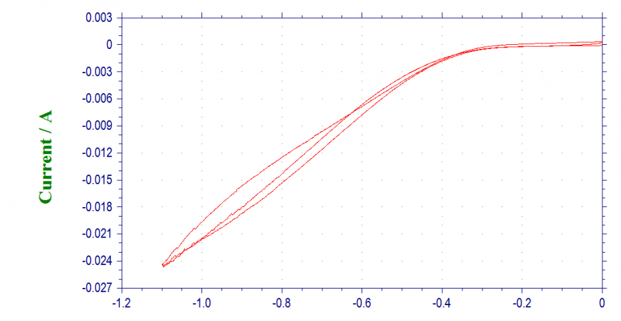 我用gas diffusion layer 做参考,按理说它应该不会出现还原反应电流,应该在循环伏安法测试时只有很小的capacitance 电流, 但是发现在-0.4V 时就有还原电流产生,并且在对电极上发现有大量气体产生。 附件是测试的结果。 测试信息