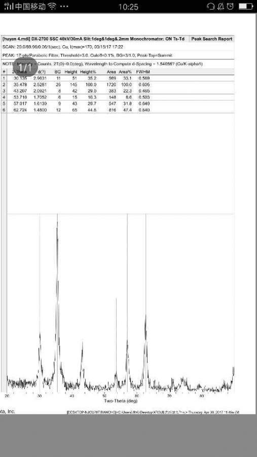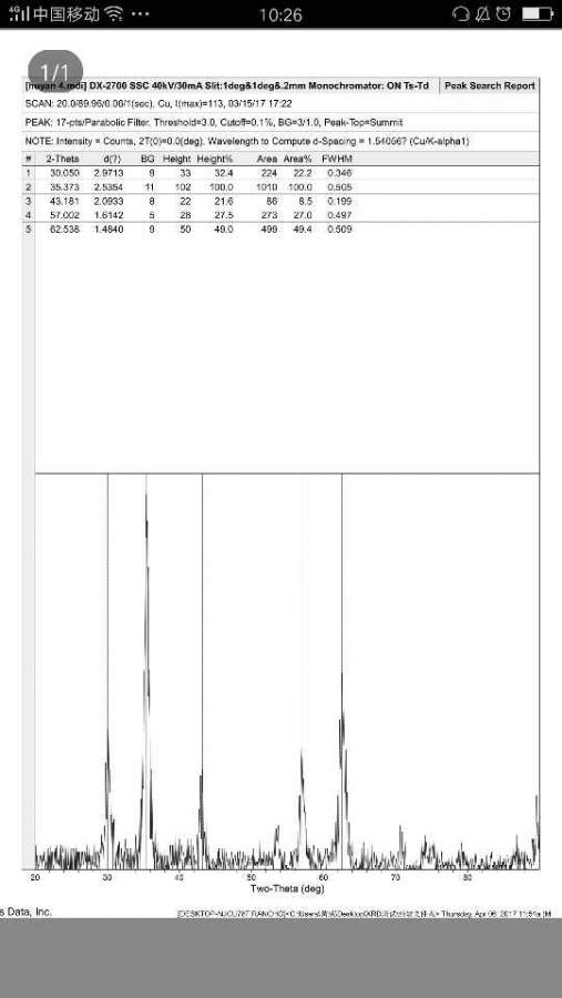 各位前辈,谁能帮帮忙看看我做的四氧化三铁XRD图像呢,毕设老师要求我给图像做定量分析,可是真看不懂数据,看了一些文献,还是没搞懂,是不是有什么公式呢,还有图中的某些参数我也不知道什么意思,求指点!谢谢! 发自小木虫Android客户端 |