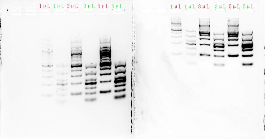 求教各位大神,琼脂糖凝胶电泳条带总是跑不好,marker也是,今天专门跑了个maker的电泳,新的TAE电泳液,新制的胶,用的染料是gelgreen,左边是1.2%,右边是1.5%。红色是200bp的,绿色是1000bp的。之前用120V、100V和75V都跑过,拖尾。今天用的是60V,还是拖尾。是哪里出了问题呢?
