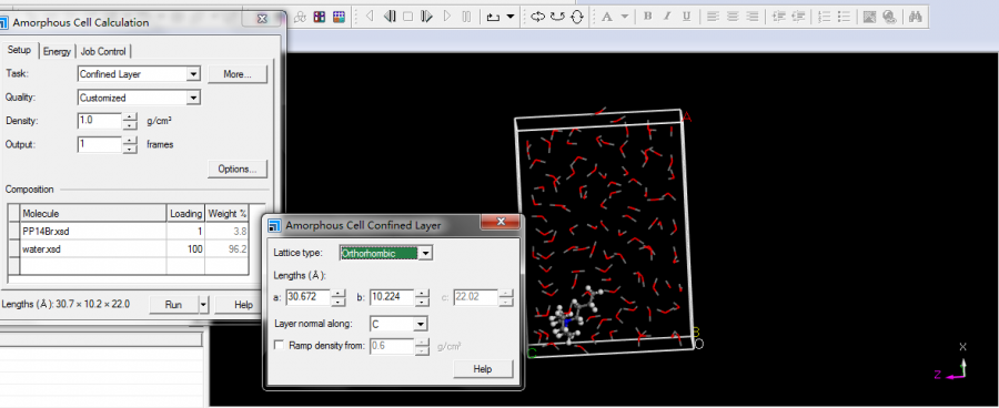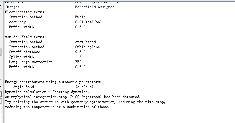 做的是铜表面在有机物的水溶液的动力学情况,铜表面用forcite结构优化,compass,cutoff为0.95nm,AC盒子建立情况为图1,最后盒子为三层,包括真空层为3层,盒子建立后有机物靠近真空层,手动把有机物移到铜表面,把靠近有机物的水分子移开(图2),跑动力学的时候总是出错误(图3),然后觉得是没优化好,就用forcite结构优化,又出错误(图4),请教一下我的错误是什么原因的?怎么解决?麻烦各位了。