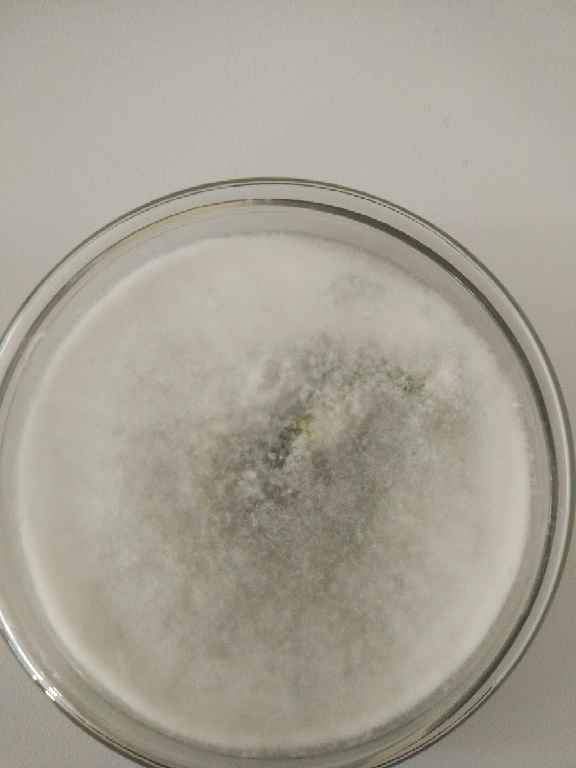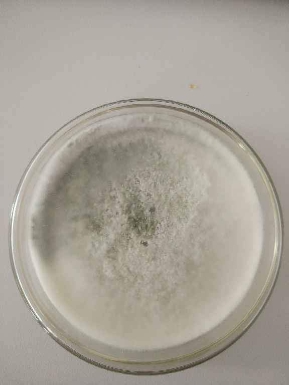 从土壤中分离得到的真菌,菌落形态如图所示,培养第二天白色菌丝铺满整个平板,第四天观察发现变绿,有没有虫友见过相似的菌落? 发自小木虫Android客户端 |