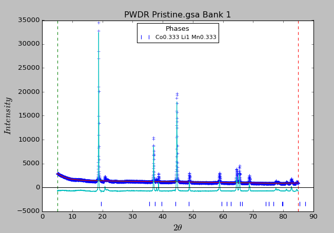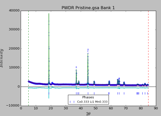 附上精修原子位置之前的报告,求各位指点 ******************************************************************************** General Structure Analysis System-II Crystal Structure Refinement by Robert B. Von Dreele & Brian H. Toby Argonne National Laboratory(C), 2010 This product includes software developed by the UChicago Argonne, LLC, as Operator of Argonne National Laboratory. Please cite: B.H. Toby & R.B. Von Dreele, J. Appl. Cryst. 46, 544-549 (2013) ******************************************************************************** Least squares controls: Refinement type: analytic Hessian Maximum number of cycles: 3 Regularize hydrogens (if any): False Initial shift factor: 1.000 Phases: Phase name: Co0.333 Li1 Mn0.333 ======================================================================================================================================= X-ray scattering factors: Symbol fa fb fc --------------------------------------------------------------------------------------------------- Ni+2 11.41660 7.40050 5.34420 0.97730 3.67660 0.24490 8.87300 22.16260 0.86140 Li+1 0.69680 0.78880 0.34140 0.15630 4.62370 1.95570 0.63160 10.09530 0.01670 Co+3 10.33800 7.88173 4.76795 0.72559 3.90969 0.23867 8.35583 18.34910 0.28667 O-2 3.76936 2.53342 1.91579 1.55094 15.07970 6.30430 40.34450 0.31291 0.22789 Mn+4 9.96253 7.97057 2.76067 0.05445 4.84850 0.28330 10.48520 27.57300 0.25188 Neutron scattering factors: Symbol isotope mass b resonant terms --------------------------------------------------------------------------------------------------- Ni+2 Nat. Abund. 58.700 1.030 Li+1 Nat. Abund. 6.941 -0.190 Co+3 Nat. Abund. 58.933 0.249 O-2 Nat. Abund. 15.999 0.581 Mn+4 Nat. Abund. 54.938 -0.375 Space Group: R -3 m The lattice is centrosymmetric R-centered trigonal The Laue symmetry is 3m1 The lattice point group is -3m Multiplicity of a general site is 36 The inversion center is located at 0,0,0 The equivalent positions are: (0,0,0; 1/3,2/3,2/3; 2/3,1/3,1/3)+ ( 1) X, Y, Z ( 2) -Y, X-Y, Z ( 3) Y-X, -X, Z ( 4) Y-X, Y, Z ( 5) -Y, -X, Z ( 6) X, X-Y, Z Atoms: name type refine? x y z frac site sym mult I/A Uiso U11 U22 U33 U12 U13 U23 --------------------------------------------------------------------------------------------------------------------------------------- Li1 Li+1 0.00000 0.00000 0.00000 0.975-3m(100) 3 I 0.01000 Co1 Co+3 0.00000 0.00000 0.50000 0.333-3m(100) 3 I 0.01000 Ni1 Ni+2 0.00000 0.00000 0.50000 0.309-3m(100) 3 I 0.01000 Mn1 Mn+4 0.00000 0.00000 0.50000 0.333-3m(100) 3 I 0.01000 O1 O-2 0.00000 0.00000 0.24110 1.000 3m(100) 6 I 0.01000 Li2 Li+1 0.00000 0.00000 0.50000 0.025-3m(100) 3 I 0.01000 Ni2 Ni+2 0.00000 0.00000 0.00000 0.025-3m(100) 3 I 0.01000 Unit cell: a = 2.85871 b = 2.85871 c = 14.22720 alpha = 90.000 beta = 90.000 gamma = 120.000 volume = 100.691 Refine? True Spherical harmonics texture: Order:0 Phase: Co0.333 Li1 Mn0.333 in histogram: PWDR Pristine.gsa Bank 1 ======================================================================================================================================= Phase fraction : 1.0000 Refine? False Extinction coeff: 0.0000 Refine? False March-Dollase PO: 1.0000 Refine? False Axis: 0 0 1 Size model : isotropic equatorial: 1.000 Refine? True LG mixing coeff.: 1.0000 Refine? False Mustrain model: isotropic equatorial: 1000.0 Refine? True LG mixing coeff.: 1.0000 Refine? False Hydrostatic/elastic strain: names : D11 D33 values: 0 0 refine: False False Histogram: PWDR Pristine.gsa Bank 1 histogram Id: 0 ======================================================================================================================================= Instrument type: Bragg-Brentano Histogram limits: 5.00 deg to 85.01 deg Sample Parameters: Goniometer omega = 0.00, chi = 0.00, phi = 0.00 name : Scale Shift Transparency SurfRoughA SurfRoughB value : 49.9640 -51.1872 0.0000 0.0000 0.0000 refine: True True False False False Instrument Parameters: name : Azimuth Bank I(L2)/I(L1) Lam1 Lam2 Polariz. SH/L U value : 0.000000 1.000000 0.500000 1.540500 1.544300 0.700000 0.002000 2.000000 refine: False False False False False name : V W X Y Zero value : -2.000000 5.000000 0.000000 0.000000 0.000000 refine: False False False False False Background function: chebyschev Refine? True Coefficients: 1121.560 -540.523 -660.275 2450.153 4420.846 -8734.928 -9989.495 9915.896 8358.299 -602.288 -1347.907 -3599.143 Refinement results: --------------------------------------------------------------------------------------------------------------------------------------- Number of function calls: 7 No. of observations: 4063 No. of parameters: 18 User rejected: 0 Sp. gp. extinct: 0 Refinement time = 2.292s, 0.573s/cycle, for 4 cycles wR = 7.50%, chi**2 = 30794.4, GOF = 2.76 ---------------------------------------------------------------------------------------------------------------------------------- Variables generated by constraints name : 0::A0 value : 0.1640 sig : 0.0000 Phases: Result for phase: Co0.333 Li1 Mn0.333 ======================================================================================================================================= Reciprocal metric tensor: names : A11 A22 A33 A12 A13 A23 values: 0.164031945 0.164031945 0.004933352 0.164031945 0.000000000 0.000000000 esds : 0.000006881 0.000000456 New unit cell: names : a b c alpha beta gamma Volume values: 2.851052 2.851052 14.237342 90.0000 90.0000 120.0000 100.224 esds : 0.000100 0.000100 0.000657 0.007 Atoms: name x y z frac Uiso U11 U22 U33 U12 U13 U23 --------------------------------------------------------------------------------------------------------------------------------------- Li1 Li+1: values: 0.00000 0.00000 0.00000 0.975 0.01000 sig : Co1 Co+3: values: 0.00000 0.00000 0.50000 0.333 0.01000 sig : Ni1 Ni+2: values: 0.00000 0.00000 0.50000 0.309 0.01000 sig : Mn1 Mn+4: values: 0.00000 0.00000 0.50000 0.333 0.01000 sig : O1 O-2: values: 0.00000 0.00000 0.24110 1.000 0.01000 sig : L