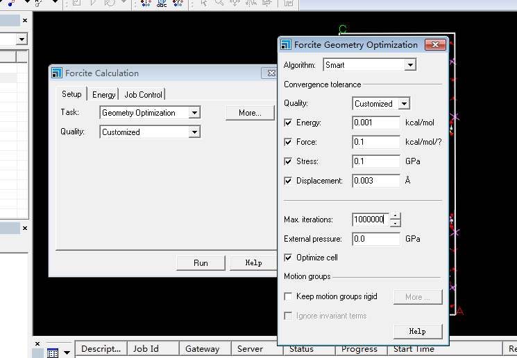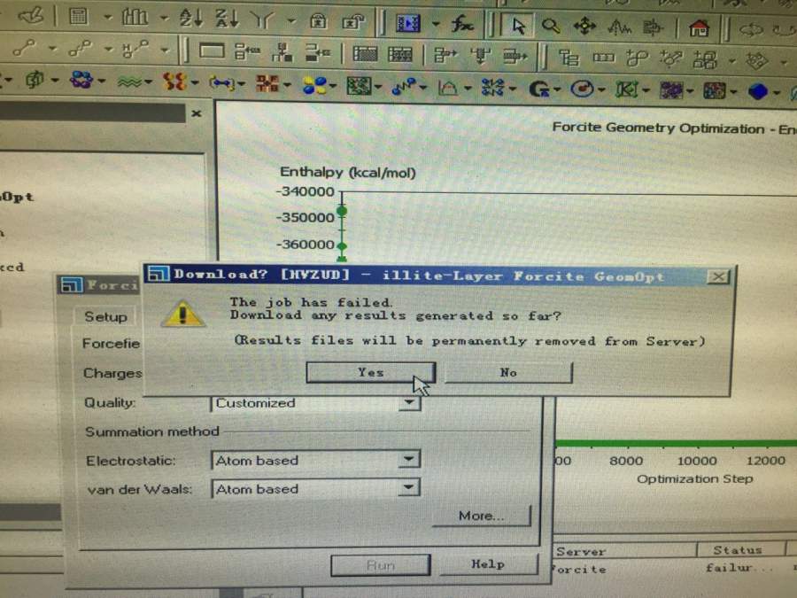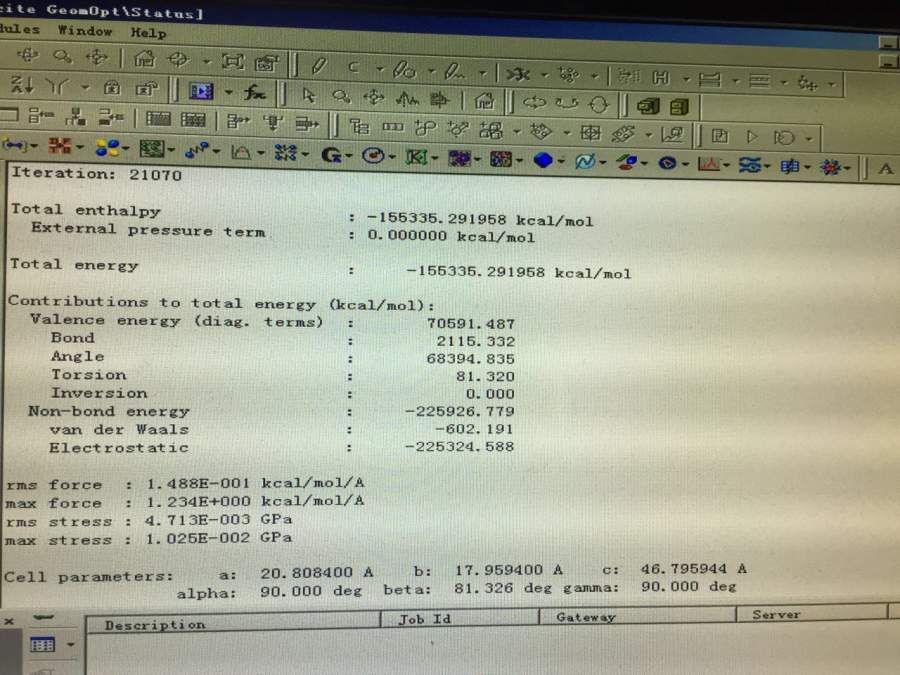 几何优化运行到2万步左右出现失败,txt文件里也没有错误提示,内容是空白的。我的模型及forcite几何优化参数设置在上传的图里,求大神帮我分析一下原因。 001.jpg 002.jpg 1.png 2.png 3.png 5.png 6.png |