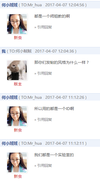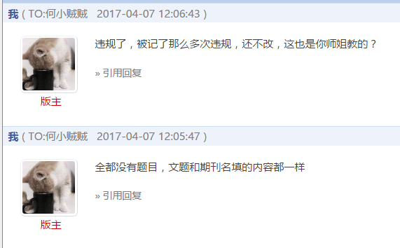 鉴于ID 何小贼贼、符之一笑、hyf714 同一天(2017-04-04) 发帖求助文献,求助文献相似,发帖IP一致为59.44.***.***,按照版规PM三个ID,情况如下 【马甲帖链接】 https://muchong.com/bbs/viewthread.php?tid=11248798 https://muchong.com/bbs/viewthread.php?tid=11248850&fpage=0 https://muchong.com/bbs/viewthread.php?tid=11248891&fpage=0 【马甲ID解释】 ID 符之一笑、hyf714 有过一次马甲行为 https://muchong.com/bbs/viewthread.php?tid=11099334&fpage=1&target=blank https://muchong.com/bbs/viewthread.php?tid=10996445&fpage=1&target=blank 【判定类型】 根据版规,认定ID 何小贼贼、符之一笑、hyf714 涉嫌一人注册多ID同天超量求助,为典型的马甲行为! 【处罚结果】 本版对于马甲求助行为一律严惩,现决定对ID 何小贼贼 处以100金币处罚,ID 符之一笑、hyf714 处以100金币并禁言一个月。 望其他求助者以此为鉴,切莫以身试法,共同营造一个健康,良好的求应助乐土。 马甲求助行为处罚标准 [ Last edited by Mr_hua on 2017-4-14 at 16:29 ] |