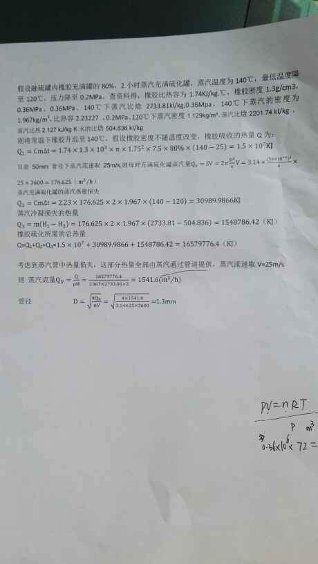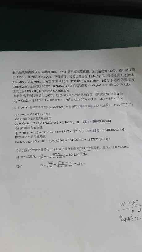 目前厂内从供汽车间到硫化罐的管道为50MM,供气量存在不足,想要将管径改大一点。改多大怎么算?硫化罐直径3.5m,高7.5m,用于橡胶改性,目前要2-3小时充满,从供气车间出来的蒸汽温度140℃,而到硫化罐的温度大概就只有100℃,压力大概只有2.5公斤,现想要确保硫化罐温度达到3.5公斤压力,140℃温度,需要多大的管径?我算了很久,算不对,不知道哪儿出问题了,求各位虫友帮助! 发自小木虫Android客户端 |