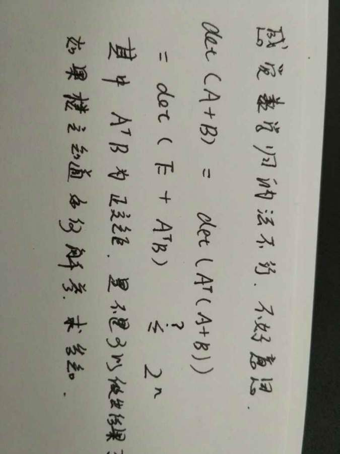 大致思路: 1. 问题等价于证明 |E+C|<=2^n, for any C 为正交矩阵; 2.注意到|E+C^T|=|E+C|,于是|E+C|=|(E+C^T)(E+C)|^1/2=|2E+C+C^T|^1/2; 3.利用性质 A正定等价于A可以写成 B*B^T的性质,我们知道(E+C^T)(E+C) 是正定的;P232 4.利用性质 若A=(a_{ij})是正定矩阵,则 |A|<=a_{11}a_{22}...a_{nn}; P236 5.注意到对正定矩阵C而言,| c_{ii}|<=1,于是(2E+C+C^T)=(d_{ij})有 |d_{ii}|<=4; 两个性质见 高等教育出版社 《高等代数(第三版)》 王萼芳 石生明 |