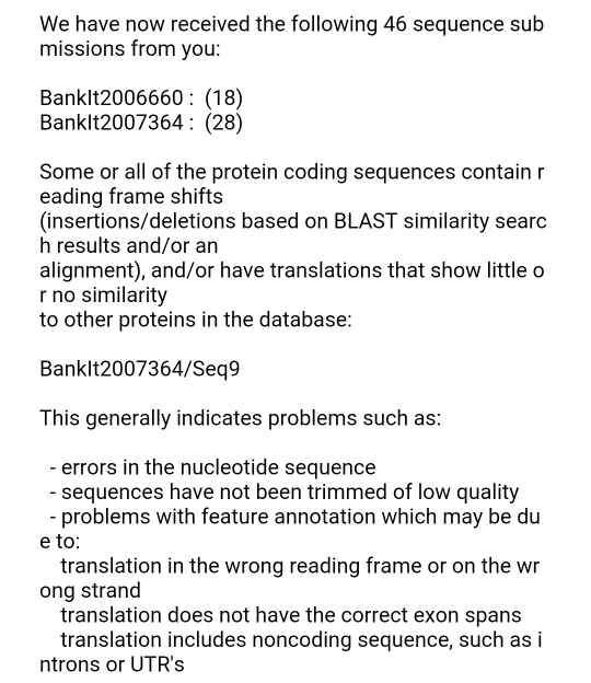 用NCBI的BankIt在线上传核酸序列,邮件回复提示错误,阅读框移位,请问要怎么确定哪些序列存在阅读框的移位,生物学小白,不懂啊,求各位成功上传过的大神解答指教,谢谢了! 发自小木虫Android客户端 |