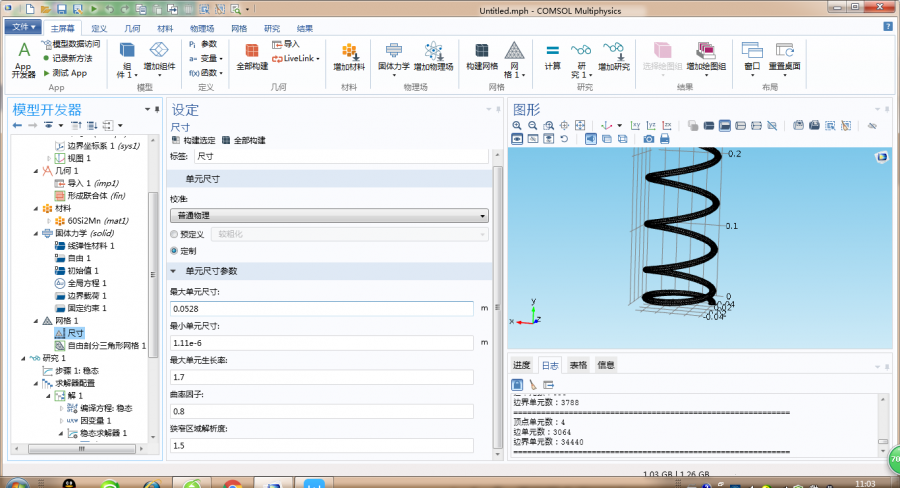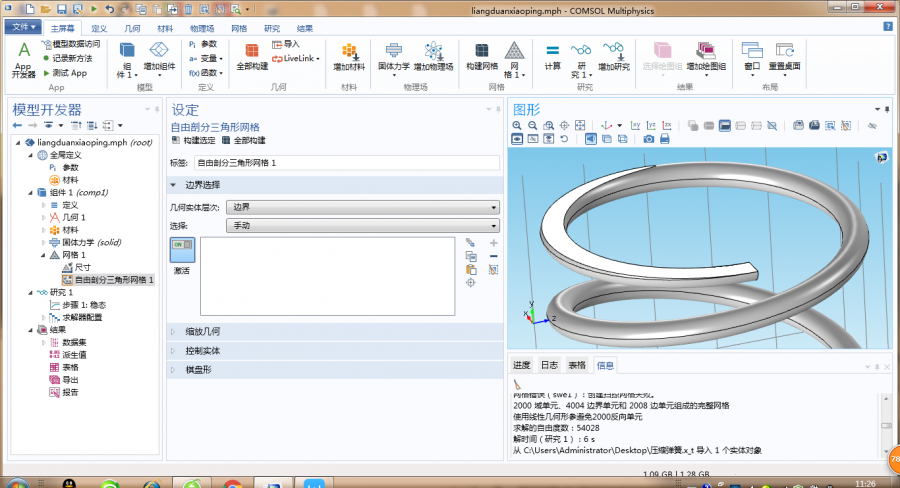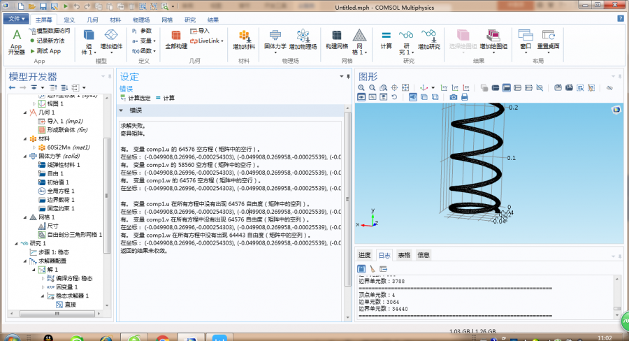 我想用comsol研究两端削平的弹簧的力学性能。就是定义一个平均位移,然后一端固定,一端加载荷,计算需要多大的力才能使弹簧的一端达到这个平均位移。力载荷加在了上面那个削平的面,计算的平均位移也是用这个面来算的。下面那个削平的面作为固定约束。但是在计算的时候提示出现了奇异矩阵,个人觉得应该是剖分网格的时候出现了问题,但做网格的时候他也没有提示有错误,很奇怪。请路过的大神来帮忙看看!不胜感激
