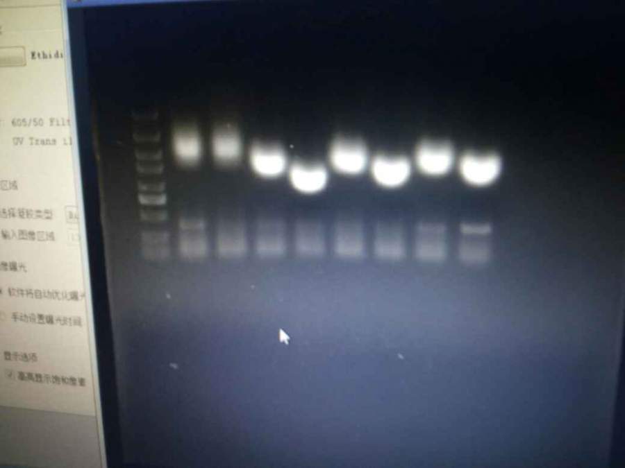 我跑的是dna凝胶电泳,最左边是marker,从上往下分别是5000、3000、2000、1000....右边1-8是同一个模板,第1个是在50度,第2、3、4、6是52度,第5个是54度,第7个是56度,第8个是58度,我的目的条带应该是2500,为什么会出现这种情况(影像不清晰,跑出的条带呈弧形、不规则,跑出的条带基本不对)请问下这个图该怎么分析呀 发自小木虫Android客户端 |
