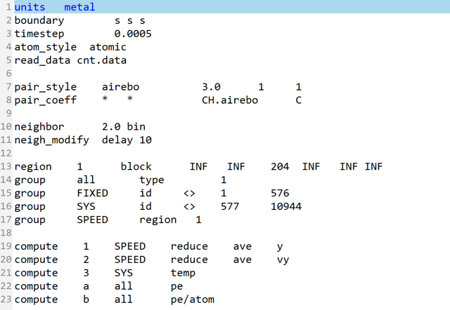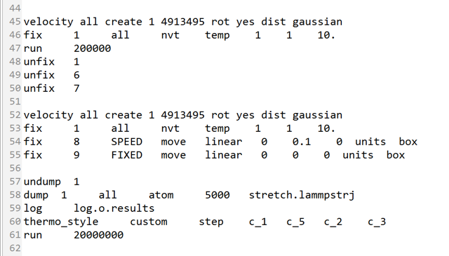 我拿到了这样一个in文件,请大家帮忙看看,如何通过它输出的量求出弹性模量? 我现在的理解是求出的数据里,分别是:y方向的平均位移y,某一块的总能量c_b,然后速度vy和温度temp。 可以通过位移(y-y0)/y0求出应变么? 我觉得是 某一块的总能量c_b=1/2 * 弹性模量E*应变的平方+初始能量c_b0 ?? 但是按照我这个算法,求出来的弹性模量不太对,一直在变化。请大家帮帮忙。 可以教教我如何通过这些输出量求出弹性模量么?谢谢! 发自小木虫IOS客户端 |