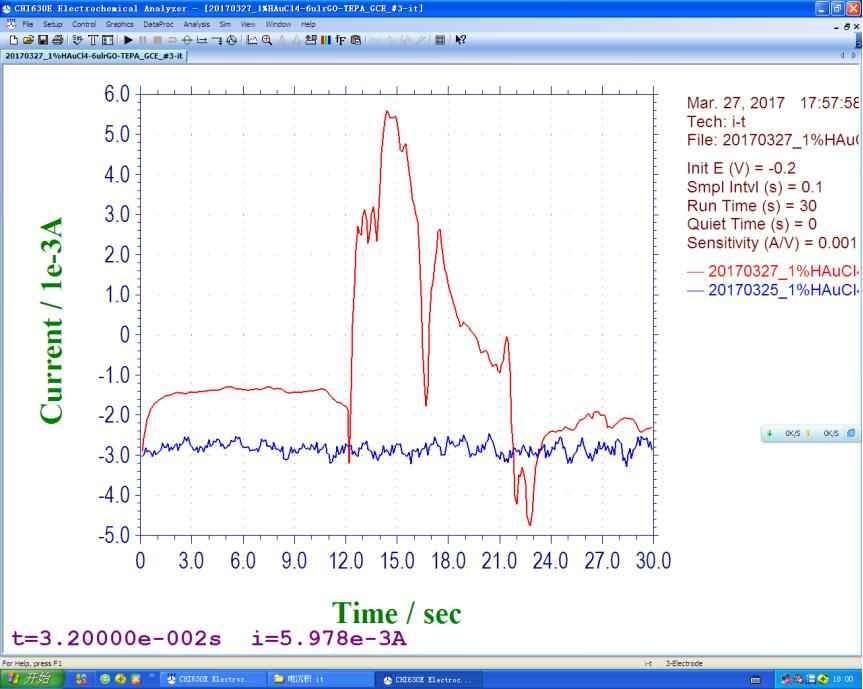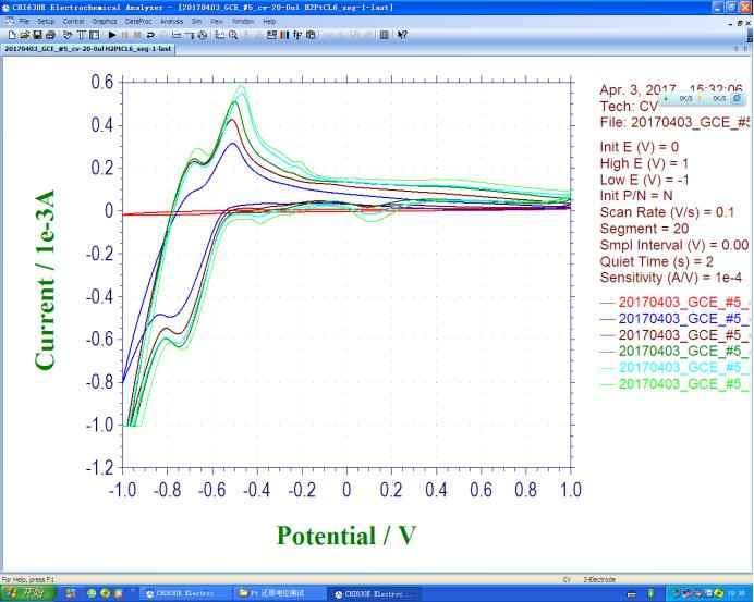 GCE 4mm 1%氯金酸/氯铂酸 左图:it 两次相同条件 沉积金纳米颗粒 右图:CV 测试pt 的还原电位 请教~ 为什么左图 两次图像差别这么大 实验条件相同 为什么右图 Pt 有这么多氧化还原峰 什么原因 或者有什么意义 请大神赐教~( ̄▽ ̄~)~ 感激不尽~( ̄▽ ̄~)~ 发自小木虫Android客户端 |
