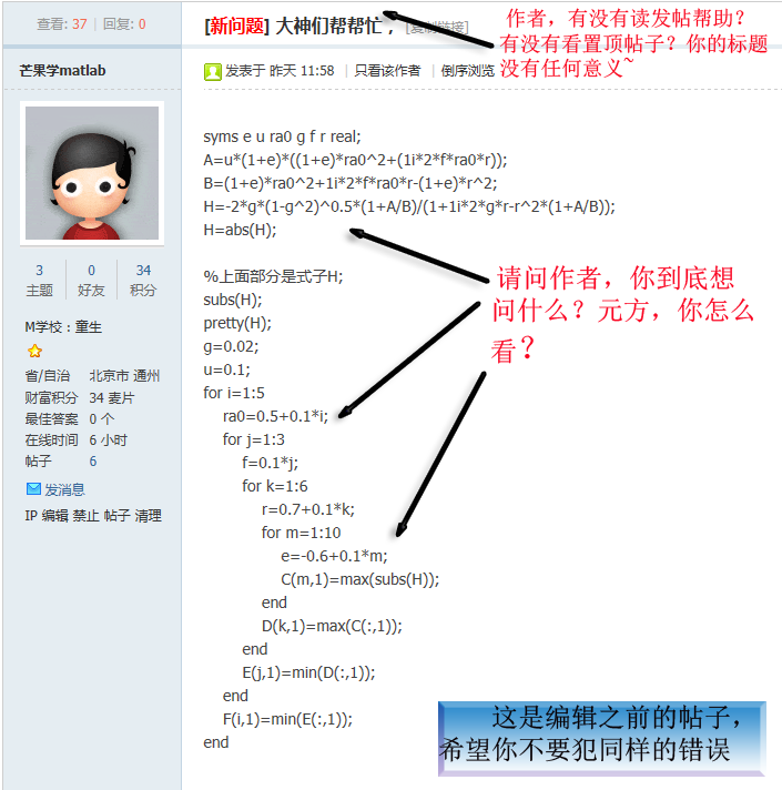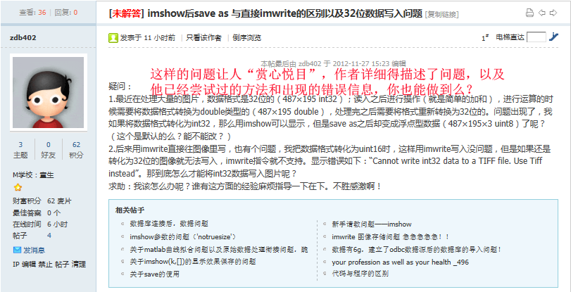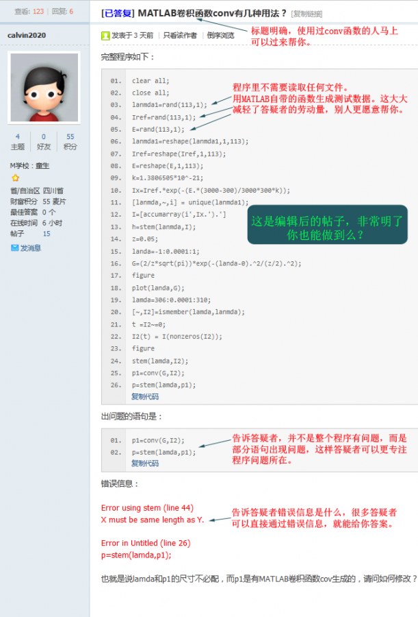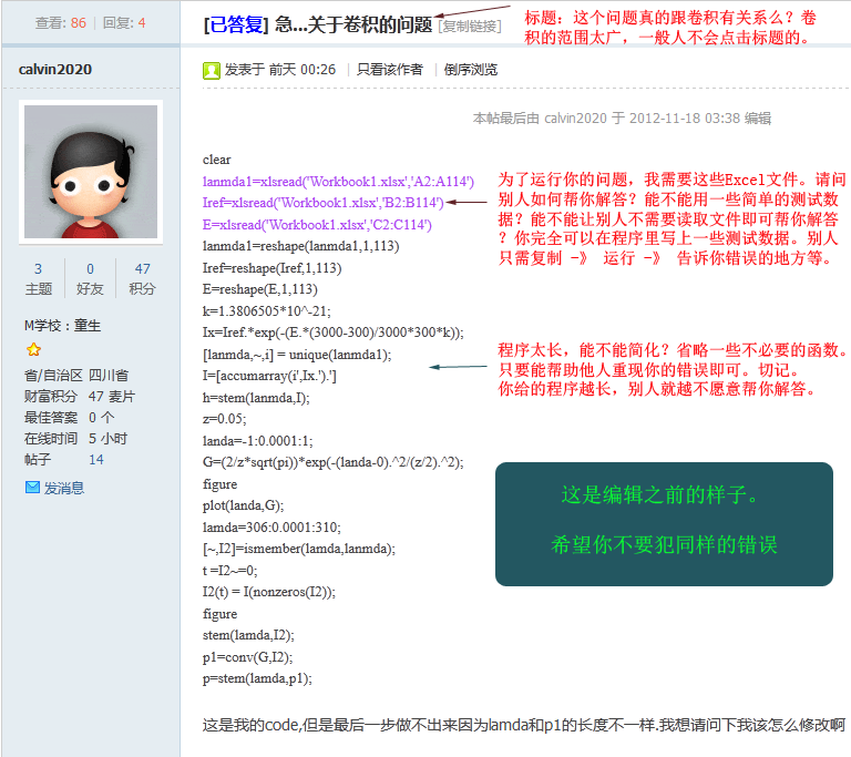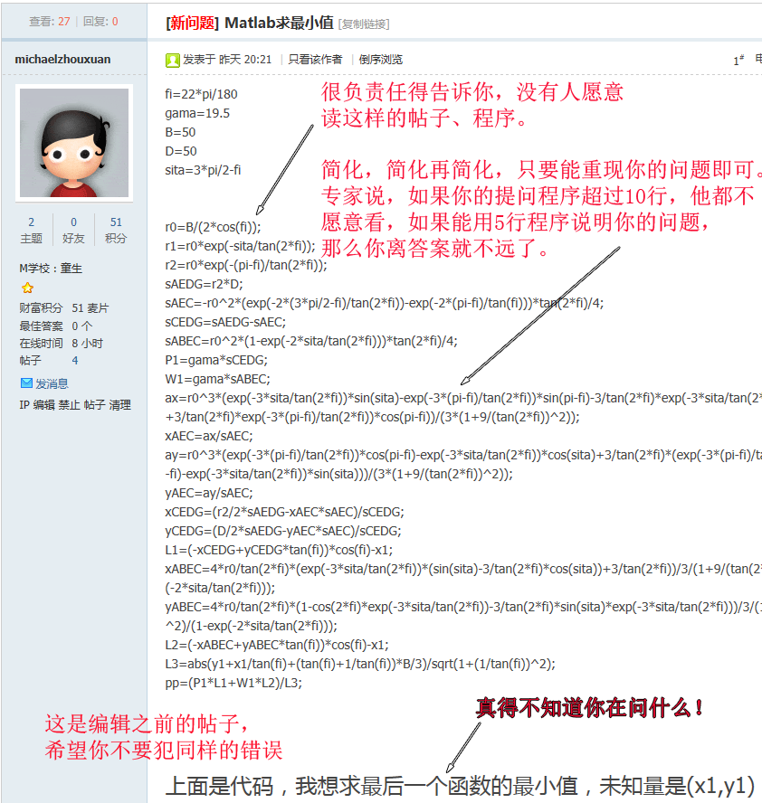 你知道如何正确提问么?请使用“最短代码-错误重现”方式(转自MATLAB中文论坛) 这个是我转的,看到很多人发帖问问题太随意,导致效率不高甚至成为了无效发帖,所以转发此帖,以供大家学习和参考 原始链接在此 什么是“最短代码-错误重现”提问方式? 1.帖子标题=帖子内容的提炼 让他人看了标题就能大概知道是否能帮助你。切勿使用“求助、急、帮忙、新手、高手、在线等”等无任何意义的词语。 2.帖子正文部分应包含以下内容: 1.粘贴一个简单的程序程序代码放在{code}这是程序代码{/code} (请把{}替换成[]),效果如下:(这个貌似有点不一样) 复制代码别人可以直接复制运行(尽量避免使用附件,Simulink模型除外); 2.贴出你的错误或警告信息(特别重要),以及你已经尝试过的方法、步骤(必要的时候,可以上传一些截图); 3.如果你使用了非MATLAB自带的工具箱函数,请打包(zip或者rar)上传你所使用的第三方函数(包); 4.写上你使用的是哪个MATLAB版本(如:64位R2012a等),以及操作系统(如:32位XP系统、64位Windows 7系统等)。 让我们来看看一些提问不清楚的范例,希望你不要犯这样的错误: 案例1, 程序依赖于外部数据,他人无法测试程序: 案例2,提问不知所云: 案例3,程序太繁杂,不能清楚反映问题所在: 再来看看一些好的范例,希望你也能做到: 案例1: 案例2: 案例3: 打开看一下吧:http://www.ilovematlab.cn/thread-215553-1-1.html 写在最后:求助的程序不要截图不要截图不要截图或者拍照!帮助你的人可没耐心一个个字手打!你自己方便了,别人可就痛苦了 |