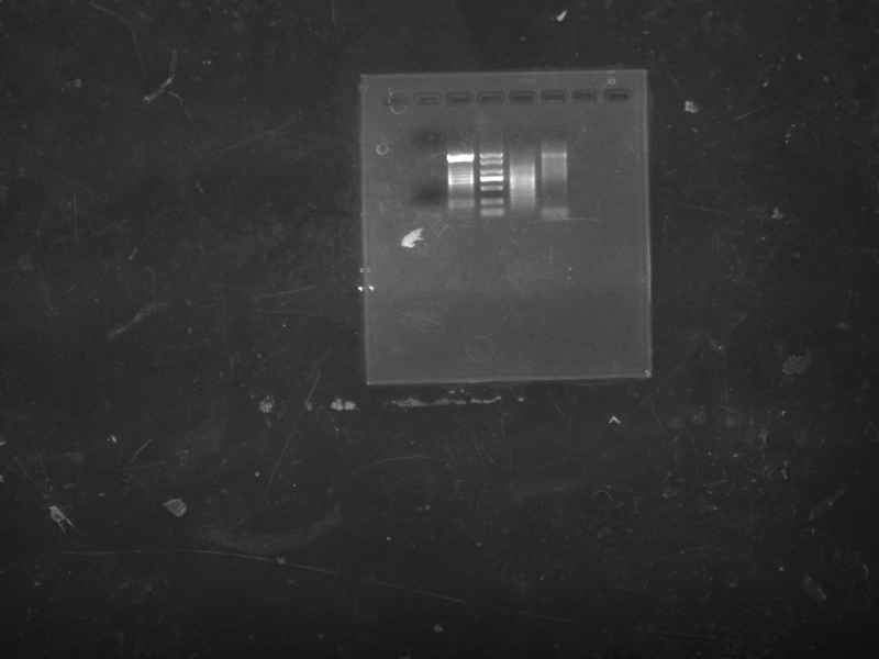 如图,胶上有八个孔,第二到第六孔点了样品,第二孔为加入了引物1和2的阴性对照,看不到条带;第三孔为加入引物1和2的PCR产物,能到看一条明显的条带,下边还有像是模糊的亮带;第四孔为2000bp marker;第五孔为加入了引物3和4的PCR产物,能看到模糊的亮带,第六孔为加入引物3和4的阴性对照,也有模糊的亮带。