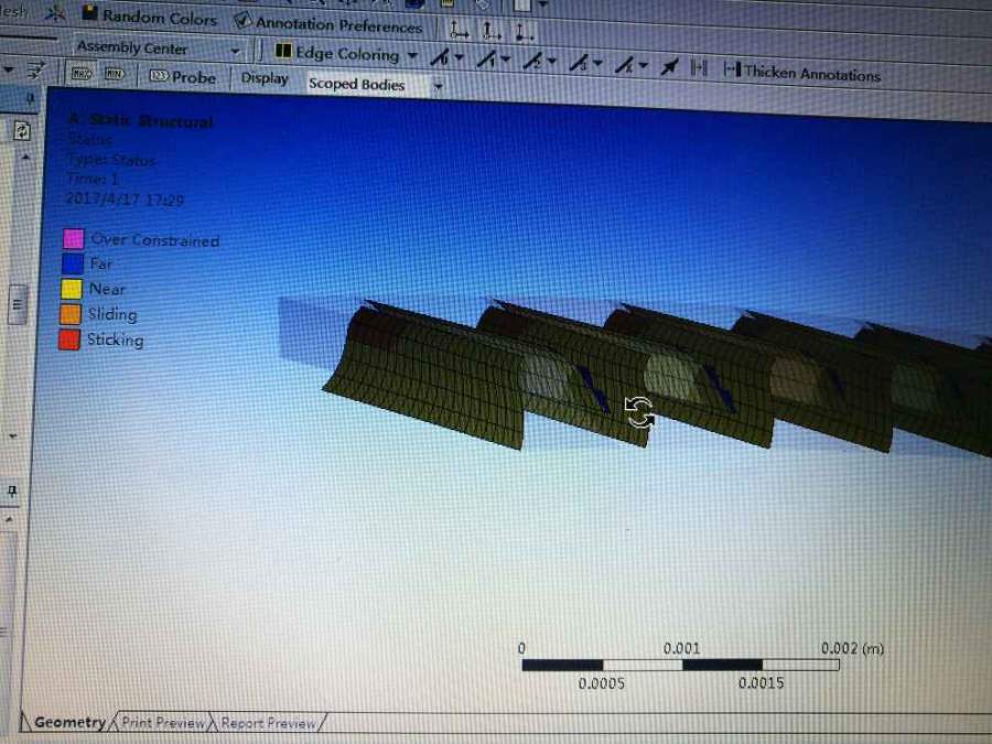 各位大神,我做的是内啮合齿轮的接触分析。我设置内部的小齿轮为接触面,外部的大齿轮为目标面。workbench接触分析后,在contact tool中插入status,得到接触状态。但是现在我发现内部齿轮上有一面没有显示接触,请问如何让内齿轮的所有接触状态都显示?谢谢了。 注:图1为齿轮啮合的实体模型,图2与3为齿轮接触状态。可以看到,内齿轮左面有接触,而右面没有接触。右面的接触显示在与之啮合的外齿轮上。 发自小木虫Android客户端 |