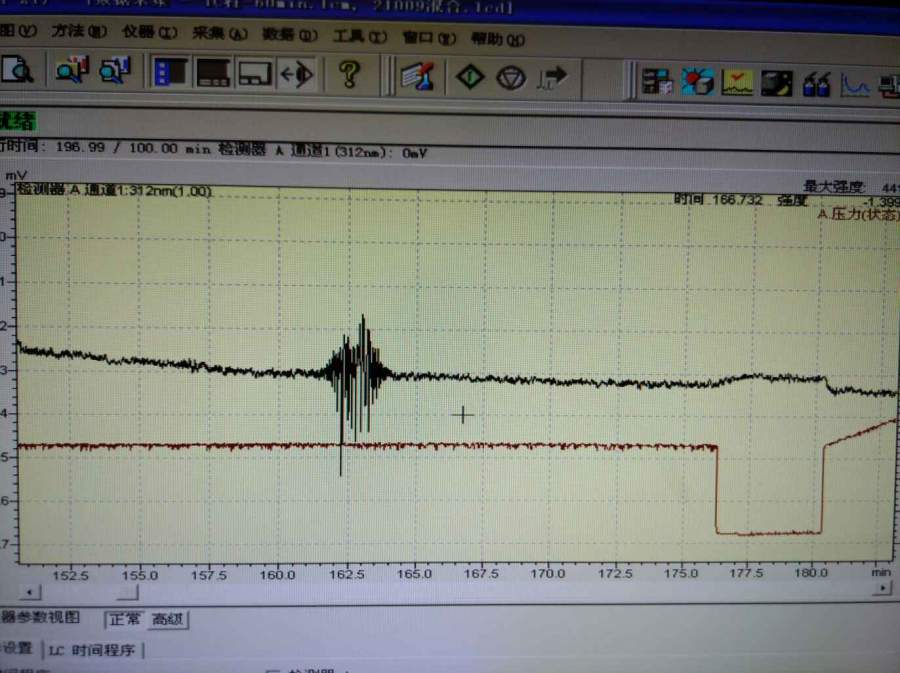 洗柱子走基线时为什么会突然出现波动?类似于噪音,如下,黑色的线为基线,目前用的是岛津液相正相柱,流动相为正己烷:异丙醇=90:10 发自小木虫Android客户端 |
