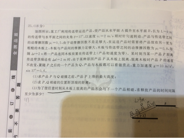 (1)设P上传送带的时间为0,初期为匀加速运动,加速度为0.8*0.8g-0.6g=0.04g, 5秒时停止加速,P距离起点5m,速度2m/s 6秒时木板消失开始作减速运动,加速度为0.5*0.8g-0.6g=0.2g,P距离起点7m,速度2m/s 7秒时木板速度为零,达到最高点距离起点8m,高度0.6*8m=0.48m (2)8秒时Q到达6秒时P的位置,距离顶端2m,P也回到同一位置,PQ相撞 (3)这个问题是问产品最多能在传送带上呆多长时间 如果产品在木板消失后差一点就能达到B面,然后接下来下滑回到A面,那么时间最长,这个过程为: 0-5秒做加速运动,运动到距离起点5m,速度2m/s 5-6.5秒做匀速运动,运动到距离起点8m,速度2m/s 6.5-7秒做减速运动,运动到距离起点9m,速度0 7-10秒做减速运动,回到起点 时间间隔最少10秒 |