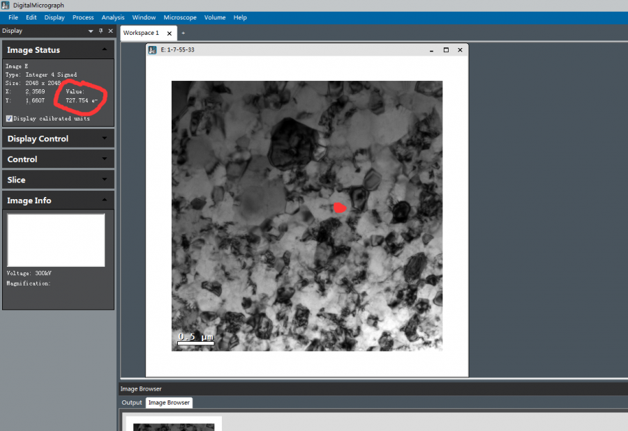 如图,使用拍了一个透射图,在对图片处理的时候鼠标在图片上时,左侧会出现x,y点坐标,另外还有一个电子数的值,请问这个是透射过试样的电子数量吗,有什么作用,怎么提取出整个图中每一个点的这个电子数值?谢谢 {V{[0Y0{UMH9D%0TQYYYK1Q.png |